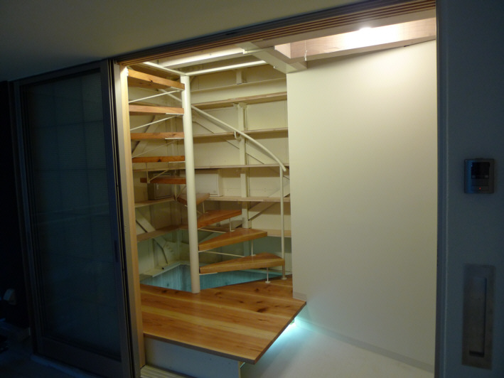 | ↑1階の玄関と階段 階段は、スペースの有効利用と見た目にも綺麗な螺旋階段です。 踏み板は厚さ50mmのムクの杉を使用、 見た目も、触れた感触も良い階段です。 |