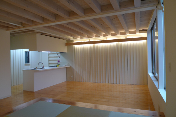 ↑2階リビング 正面は壁冷暖房 小上がりは寝転んだり、腰掛けたり、とても重宝しています。 準耐火構造ながら木の暖かさを感じられる仕上げ、 建築基準法をとことん調べて実現した工法です。 |