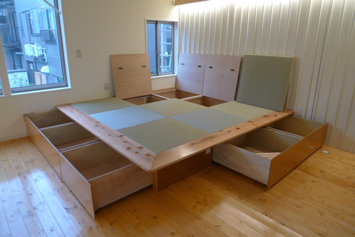 ↑2階リビングの小上がり 小上がりの下はキャスター付の収納 |