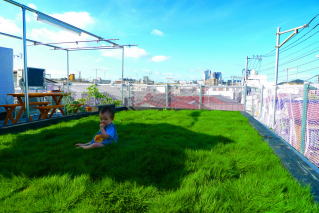 ↑屋上 屋上緑化は区の助成金を利用 2つ目の地面は、最高の快適空間。 バーベキューや家庭菜園、子供の遊びに |