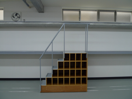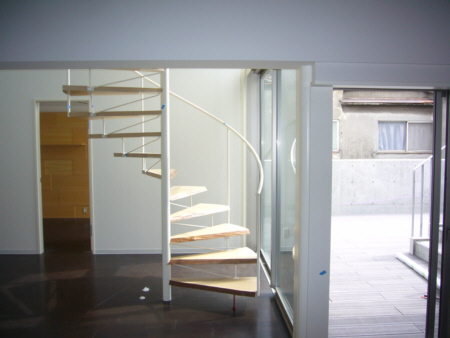| ↑1階工場 材料棚と移動式階段 | ↑2階リビング ミミ付きタモの螺旋階段 |