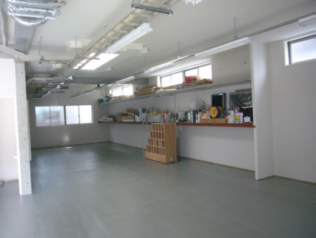 | ↑外観 間口一杯の大きな庇 | ↑1階工場 柱の無い空間、 中央のトップライトからの自然光で照明無しでも明るいです |