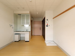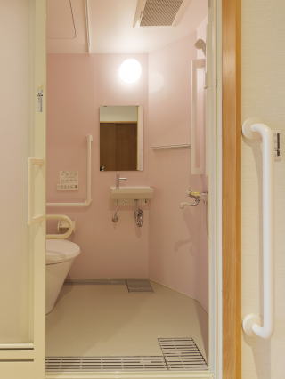 | ↑サ高住居室 車いす使用のキッチン(特注) | ↑ユニット化したトイレとシャワー(特注) |